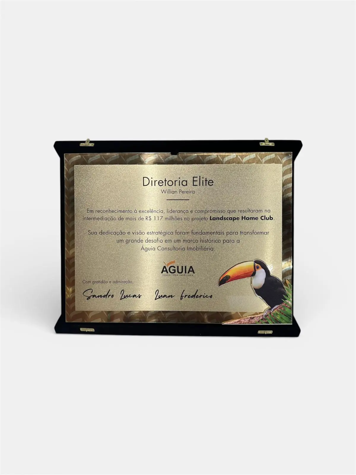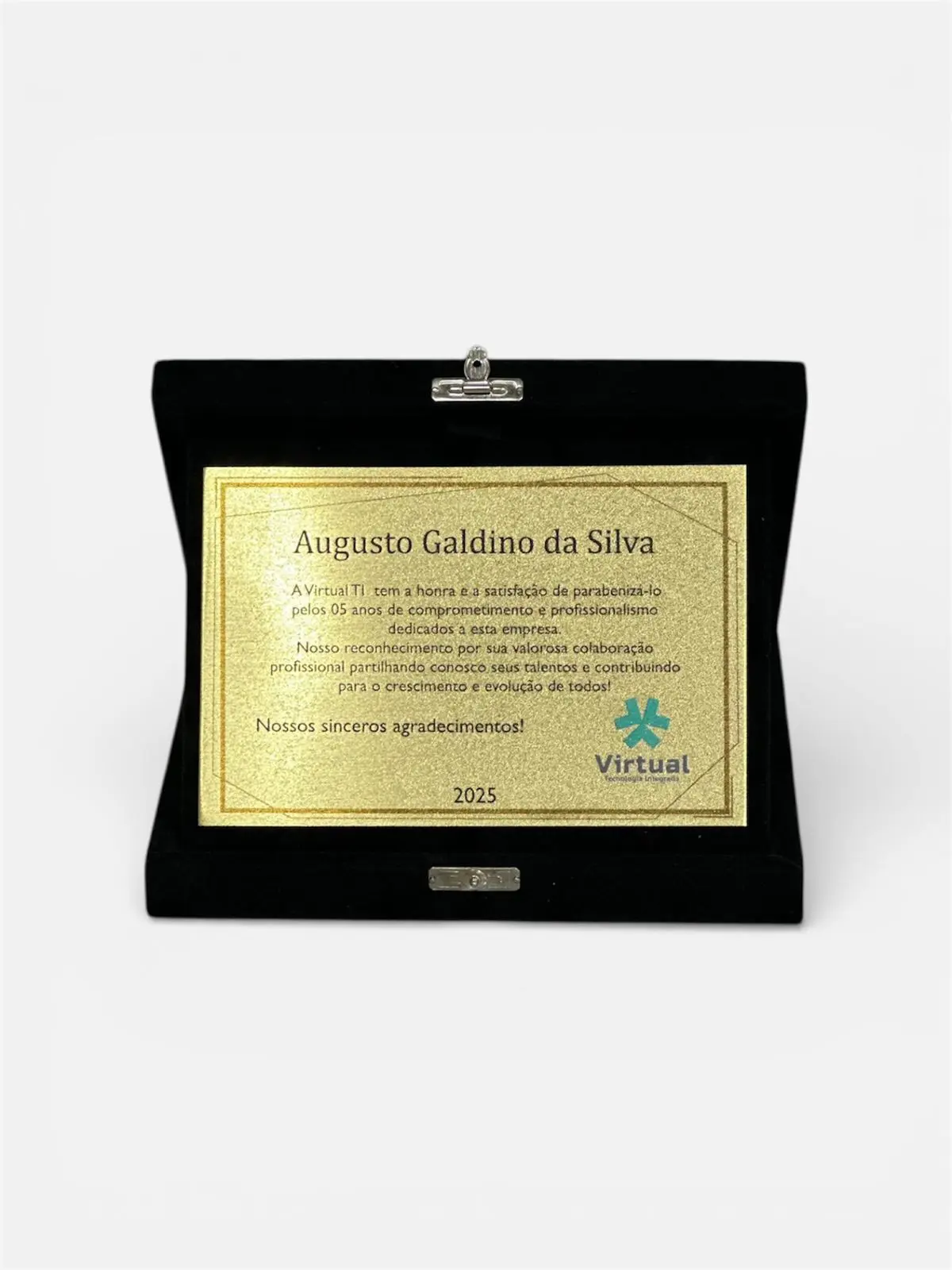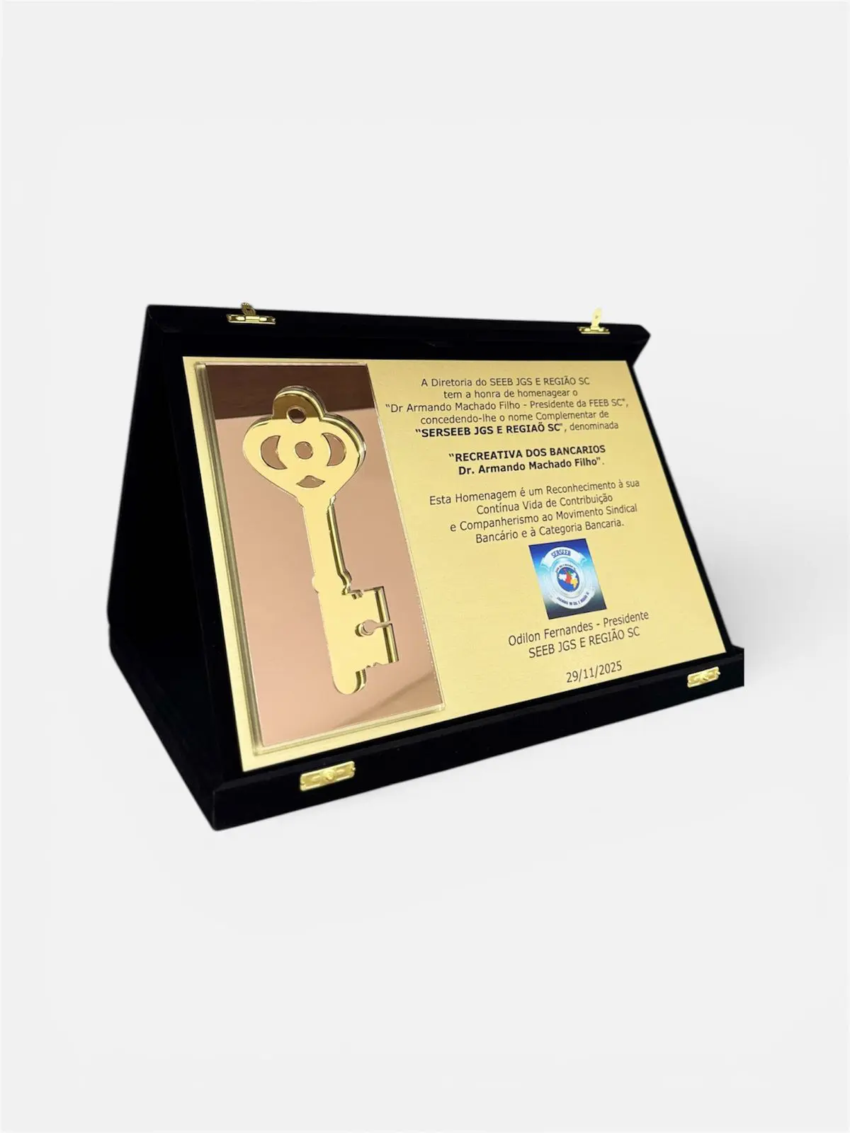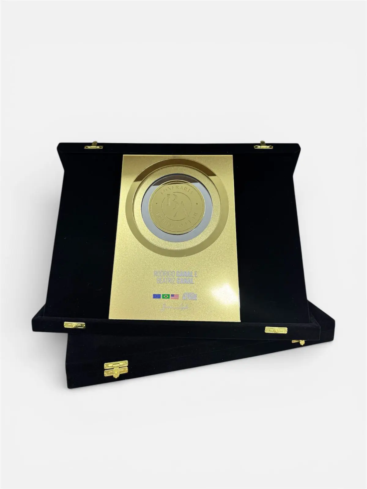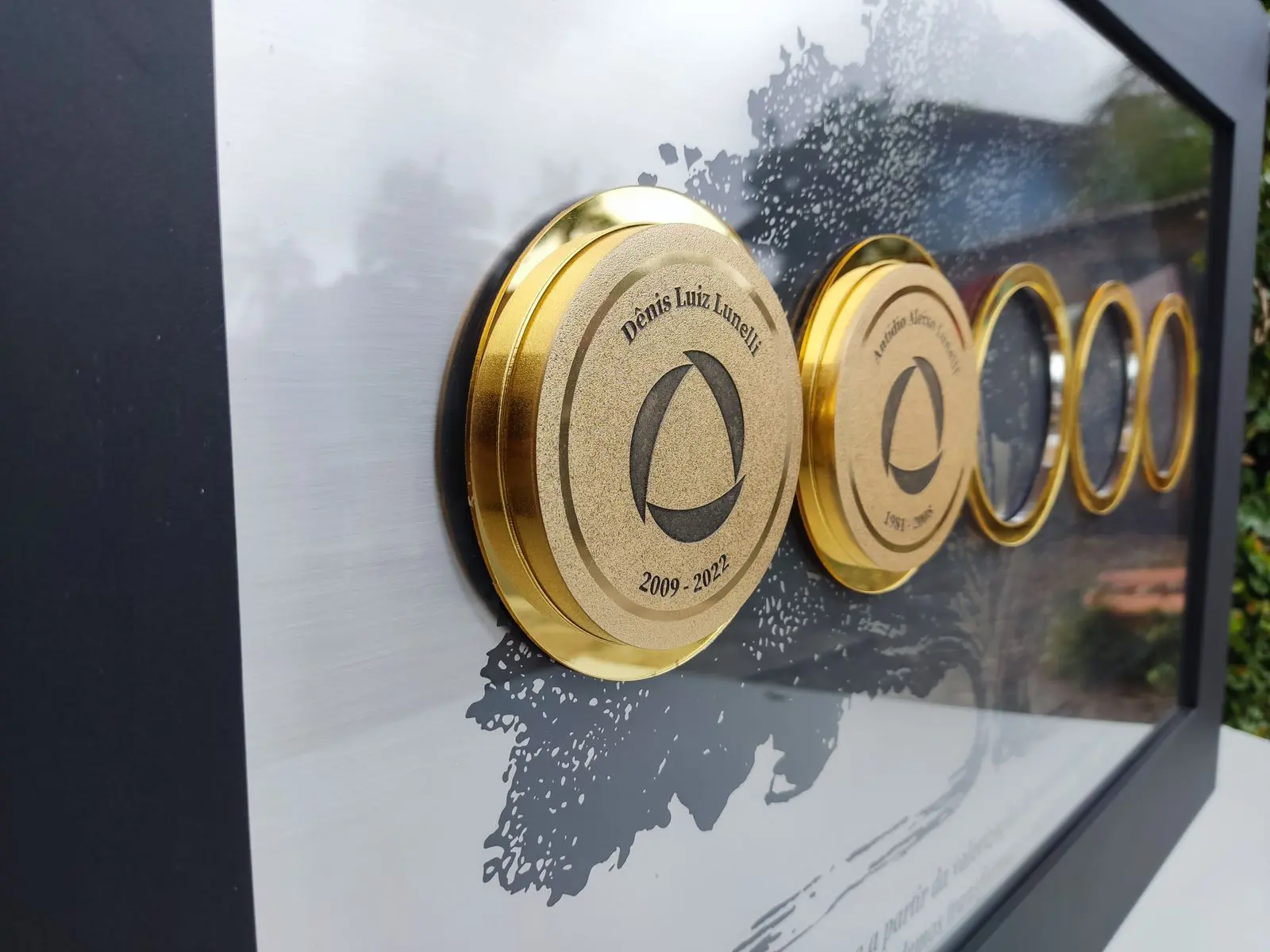 Placa de homenagem fabricada em metal latão dourado ou aço inox escovado, com gravação em alto e baixo relevo, moldura e base de acrílico lapidado. É ideal para exibição em pé, celebrando memórias com requinte e emoção.