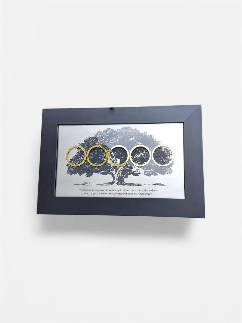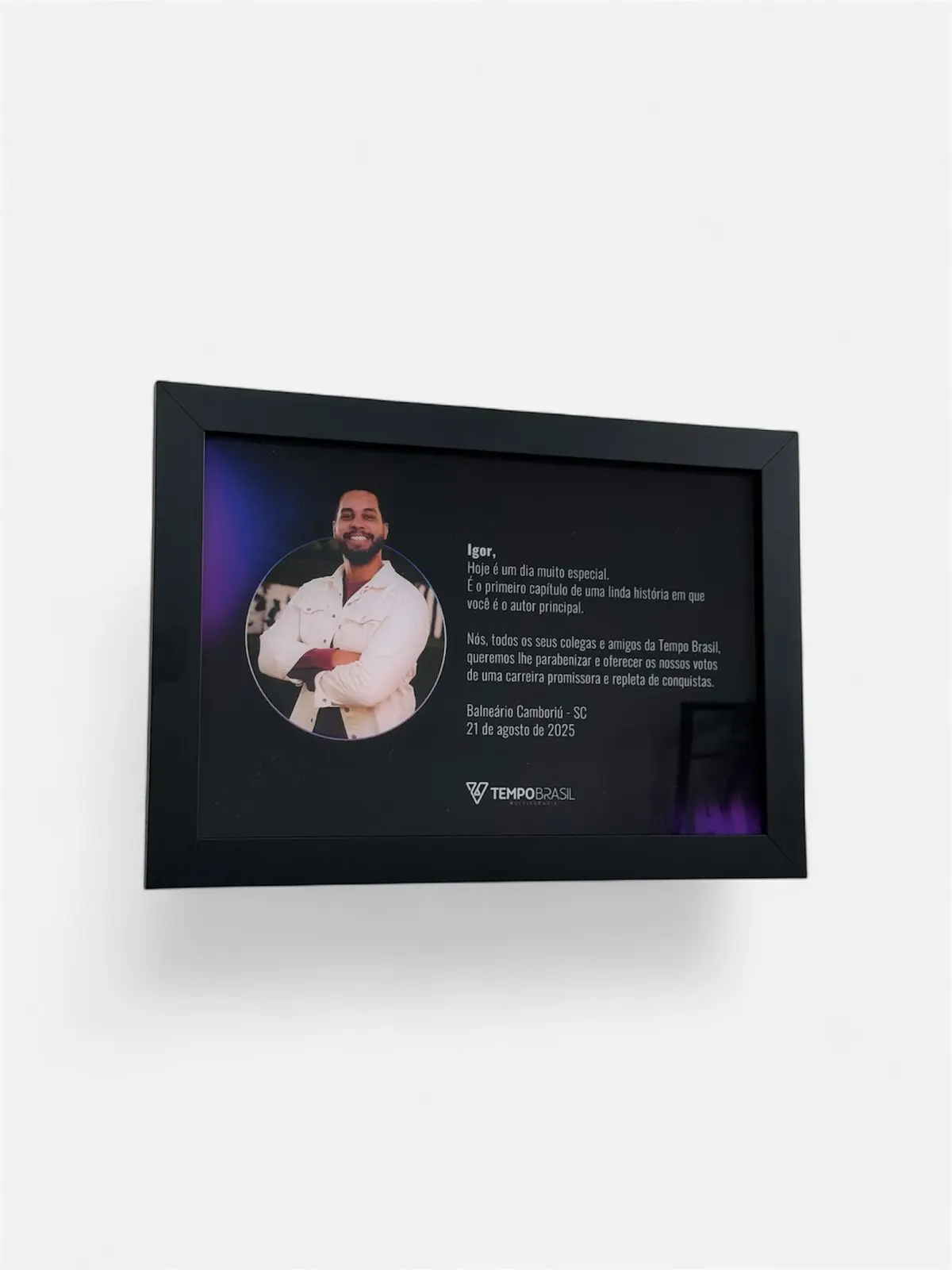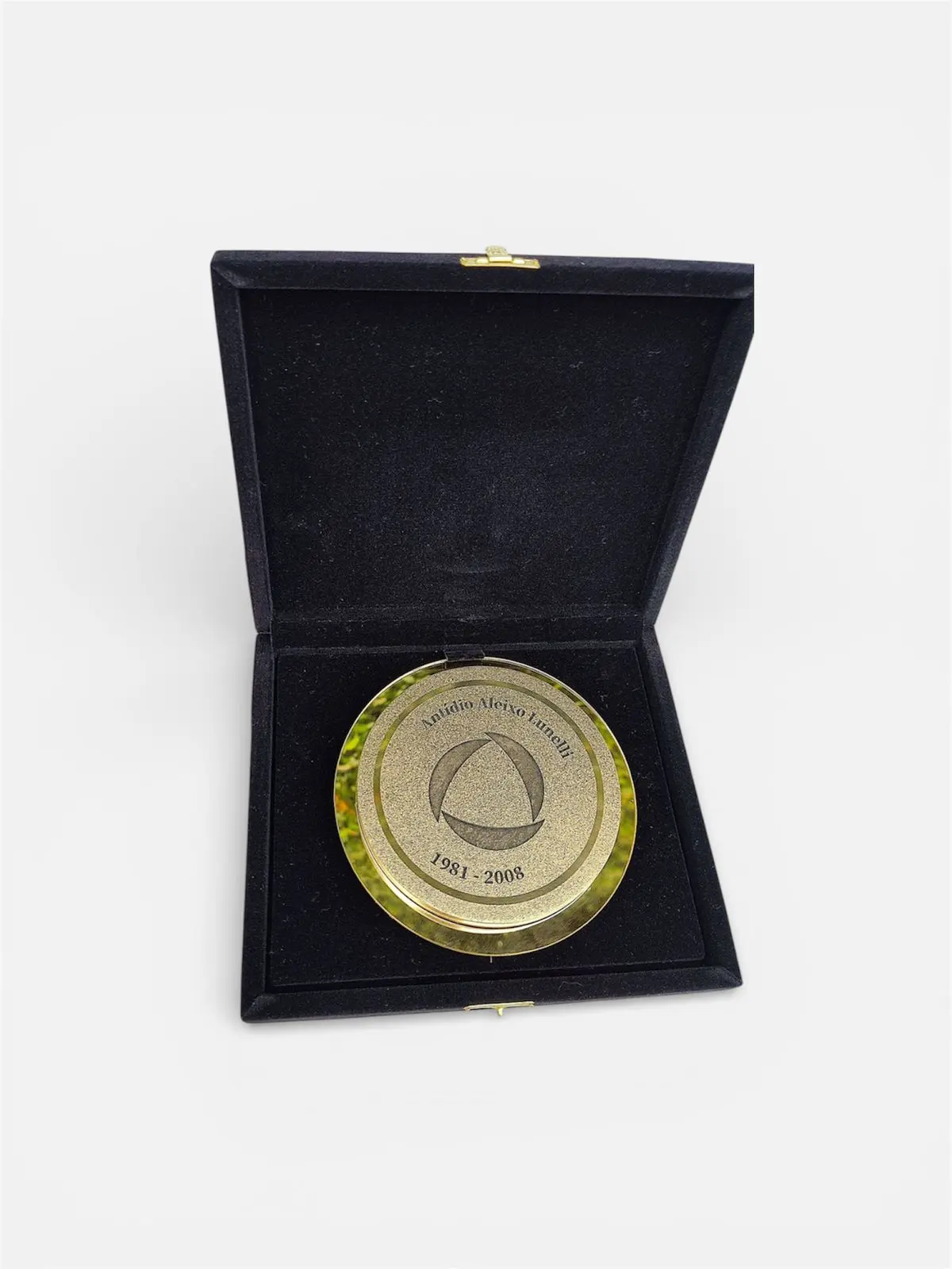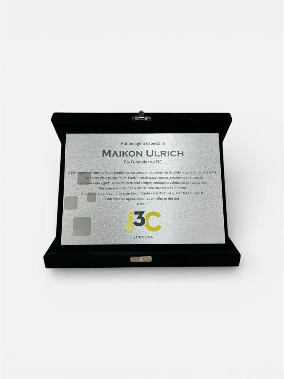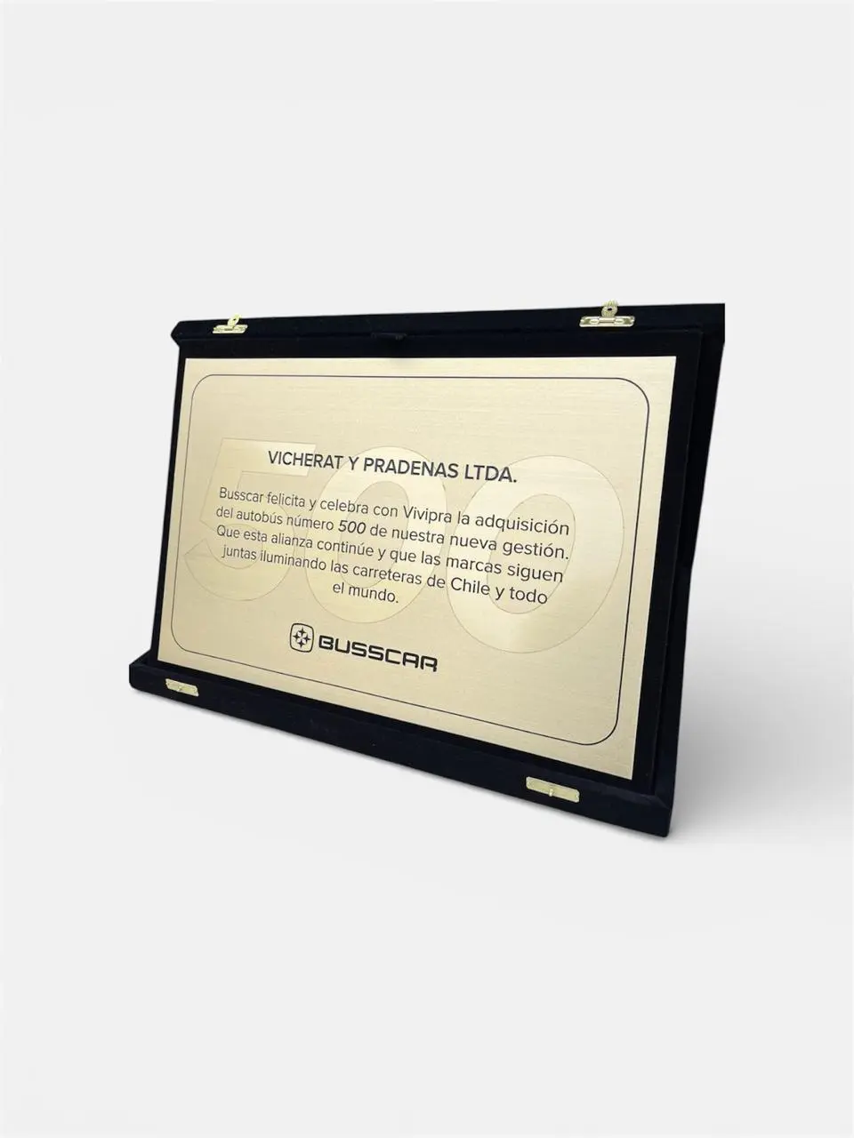Placa de homenagem fabricada em metal latão dourado ou aço inox escovado, com gravação em alto e baixo relevo, moldura e base de acrílico lapidado. É ideal para exibição em pé, celebrando memórias com requinte e emoção.